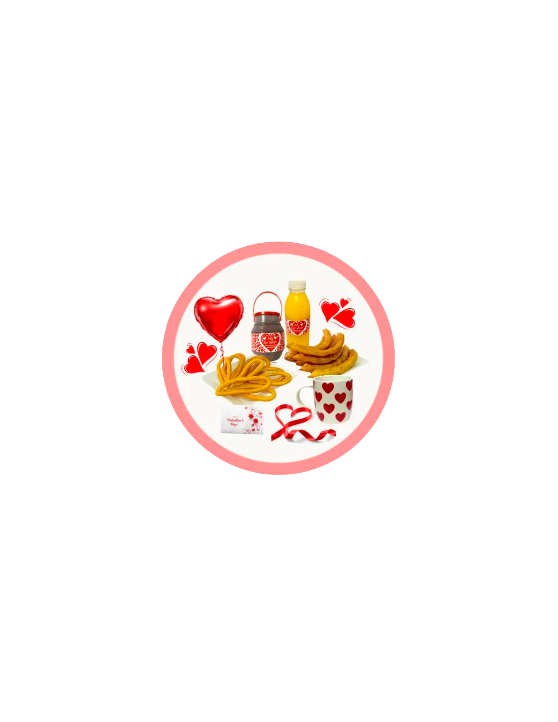 💝 Pack San Valentín, Caja decorada con: 6 churros, 6 porras, 1/2 litro de chocolate, 1/2 litro de zumo, taza, globo y tarjeta; un regalo lleno de amor.