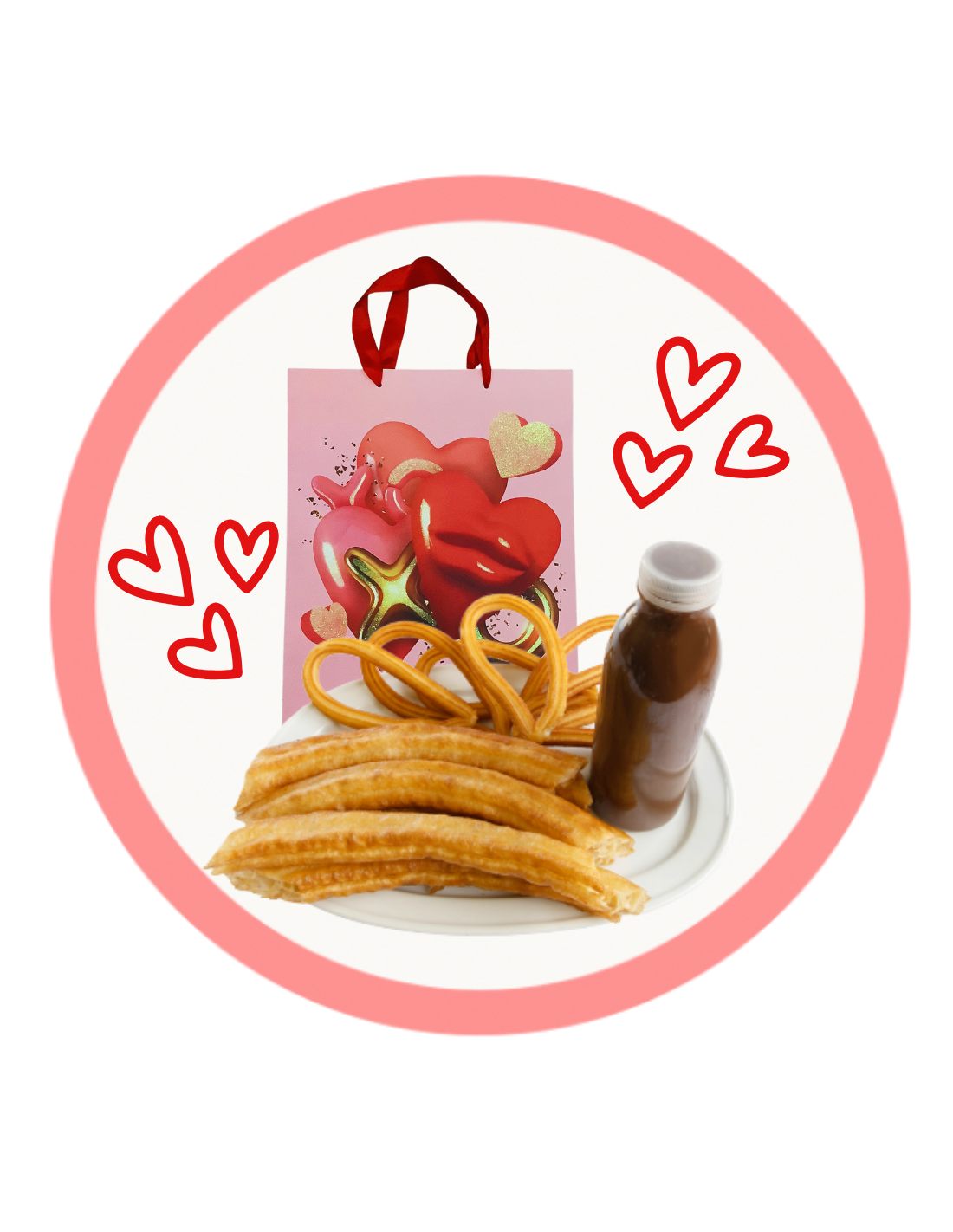 Un pack pensado para celebrar el amor: Bolsa Decorada con:10 churros, 5 porras, 1/2 litro de chocolate , combinados para sorprender y enamorar.