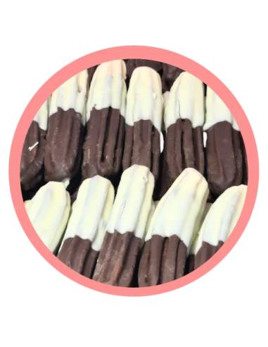 Una selección de 8 churros bañados en una fina capa de chocolate blanco y negro, ideales para quienes buscan un toque extra de sabor y sofisticación en su desayuno.